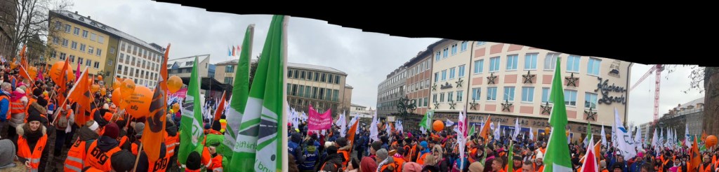 Knapp 3.000 Kolleginnen und Kollegen aller Gewerkschaften waren vor Ort. Die zweite Verhandlungsrunde endete ohne Einigung, eine dritte Runde soll ab dem 7. Dezember stattfinden. Am kommenden Montag (4. Dezember) haben die Gewerkschaften eine weitere Demonstration in München geplant.