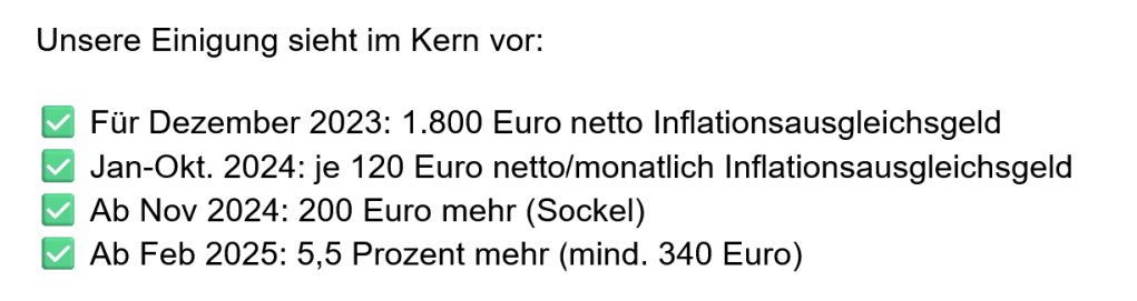 - Inflationsausgleichszahlung-Monatszahlungen in Höhe von jeweils 120 Euro für die Monate Januar 2024 bis Oktober 2024 (50 Euro für Anwärterinnen und Anwärter)