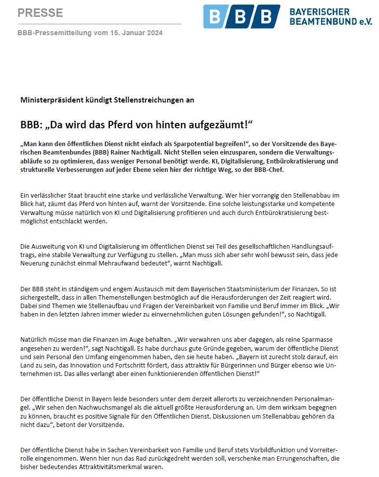 „Wir sind froh und dankbar über den Beschluss der bayerischen Staatsregierung zur Besoldungserhöhung. Das ist ein wichtiges Signal und Ausdruck der Wertschätzung gegenüber den Beamtinnen und Beamten sowie den Versorgungsempfängerinnen und -empfängern in Bayern“, erklärt BBB-Chef Rainer Nachtigall. Besonders erfreulich sei die Übertragung des Tarifabschlusses auch auf den Versorgungsbereich. Zudem enthält der aktuelle Gesetzesentwurf – neben der Sockelerhöhung um 200 Euro – auch die Erhöhung der Zulagen um 4,76 Prozent zum 1. November 2024. „Der öffentliche Dienst in Bayern setzt damit bundesweit Maßstäbe und behauptet seine Spitzenstellung im Bundesvergleich“, betont Nachtigall.
